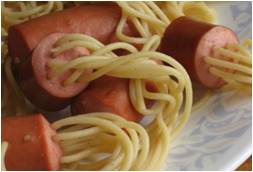 נותנים לילדים "לשפד" את הנקניקיות על מקלות הספגטי (ראו תמונה). מרתיחים מים בסיר, ומבשלים את הפסטה עם הנקניקיות. מסננים.